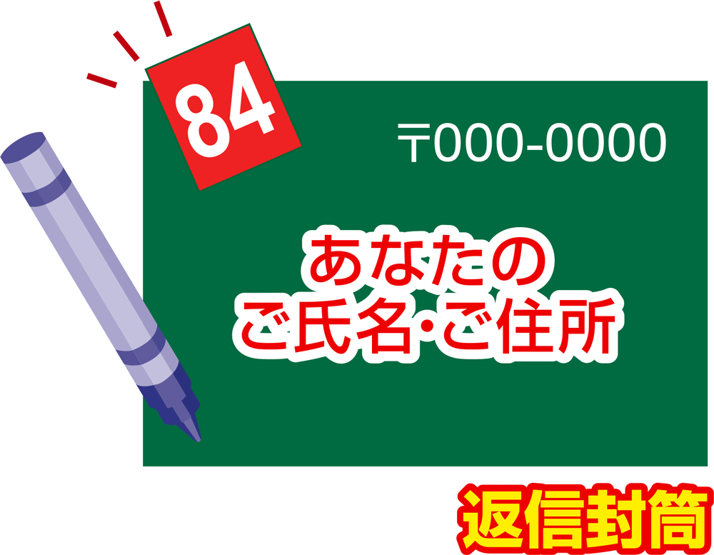 ステッカー【横150×縦83(mm)】が入る大きさの返信用封筒に「あなたのご氏名・ご住所」を記入し、84円切手を貼る
